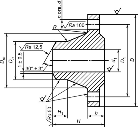 В обычных условиях наиболее надежное соединение обеспечивается сваркой встык разделанных под приварку торцов труб. Воротник фланца, таким образом, представляет собой торец трубы. Диаметр Dn совпадает с наружным диаметром трубы, а d1 – с внутренним. Однако d1 может быть изменен по требованию заказчика для совпадения с толщиной стенки трубы.